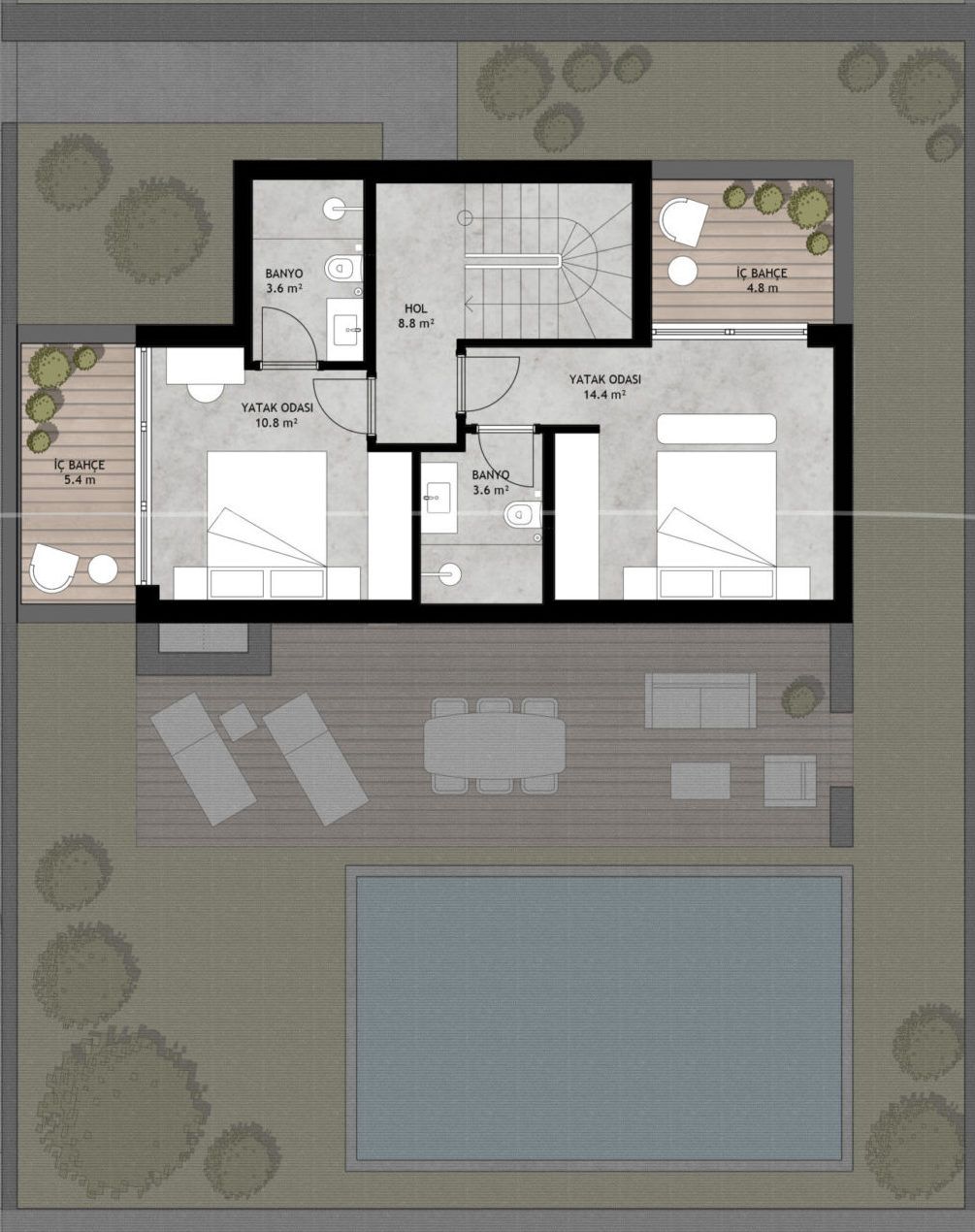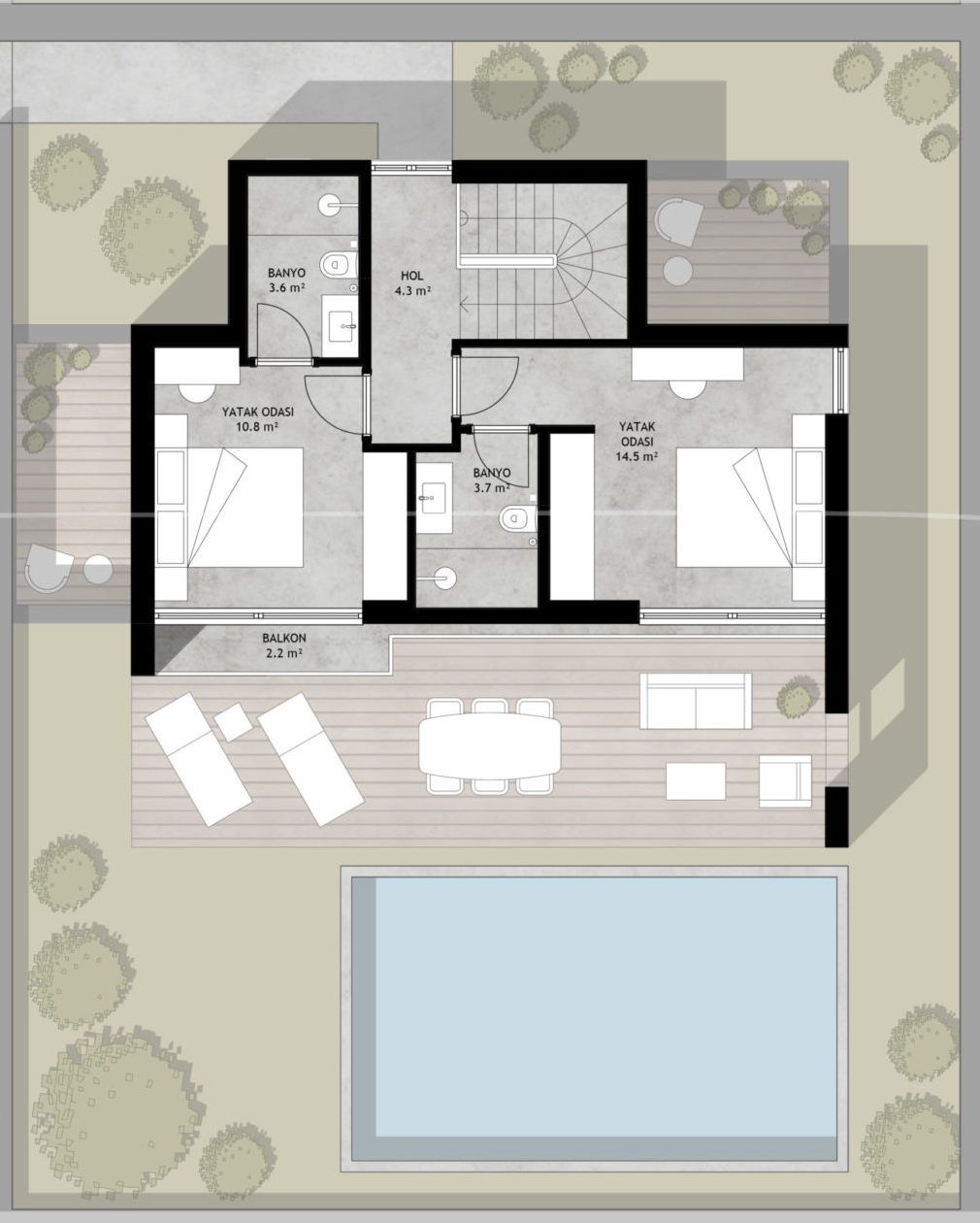 Виллы имеют планировку 4+1 с американским типом кухни. Представлено несколько вариантов, поэтому каждый покупатель может найти для себя оптимальное решение. Площадь вилл составляет от 390 до 460 квадратных метров. Во всех комнатах высокие потолки: 3,1-3,2 метра. Виллы сдаются с полной чистовой отделкой и подключенным тёплым полом. В кухне есть не только встроенная мебель, но и вся необходимая бытовая техника. У каждой спальни есть свой санузел, который также полностью оборудован