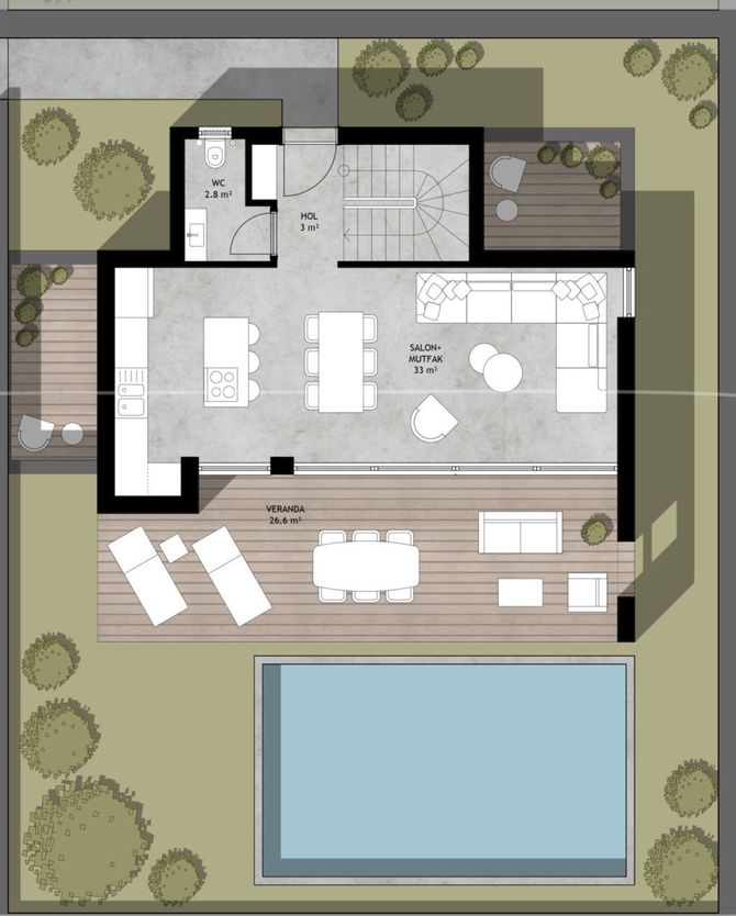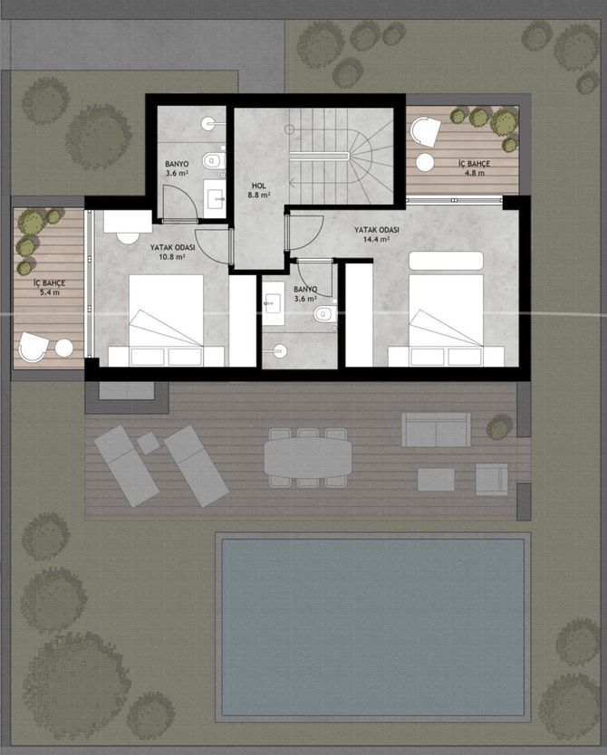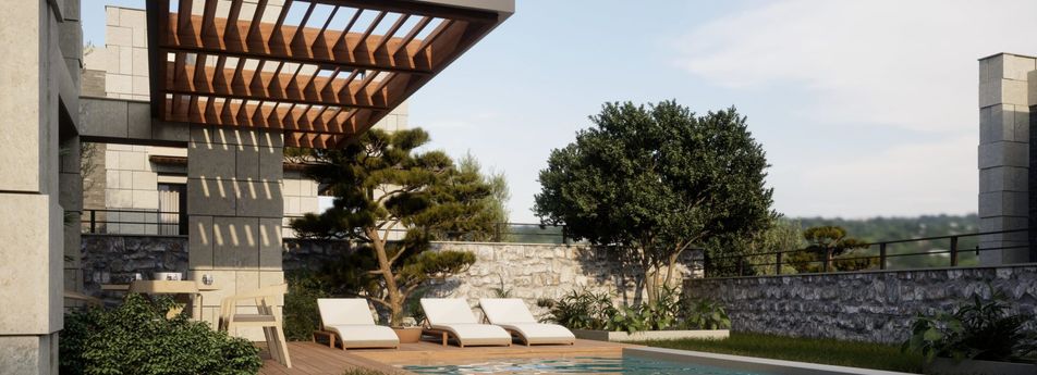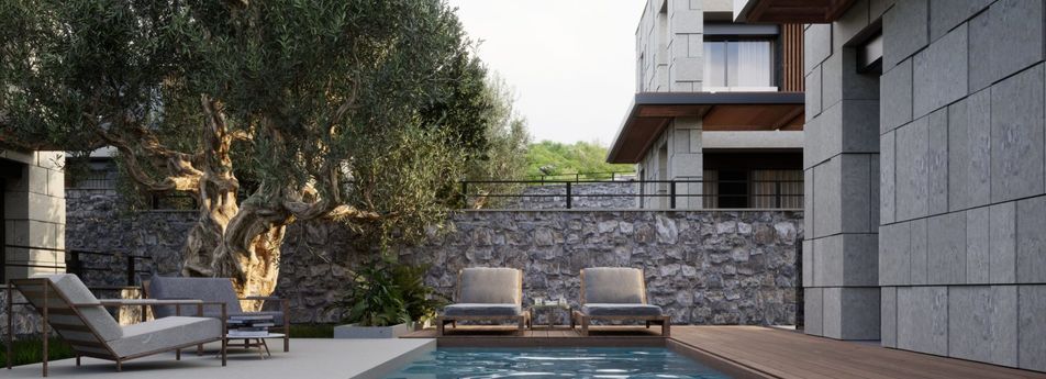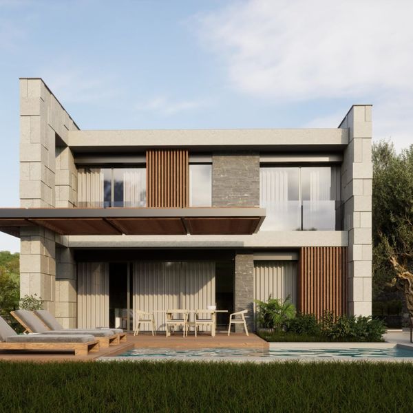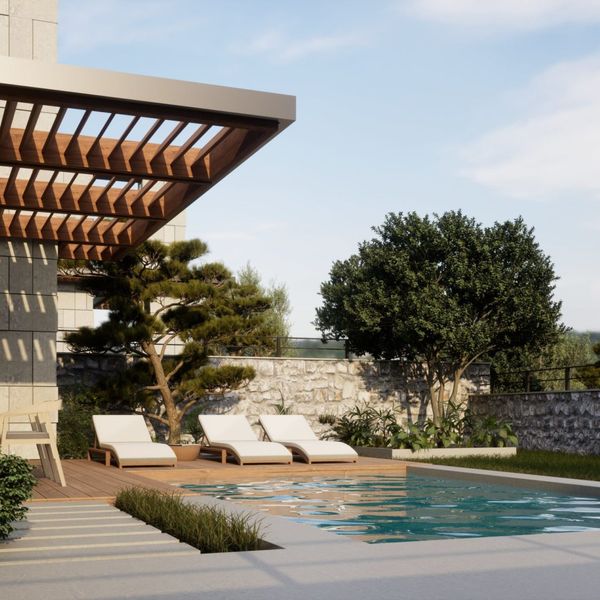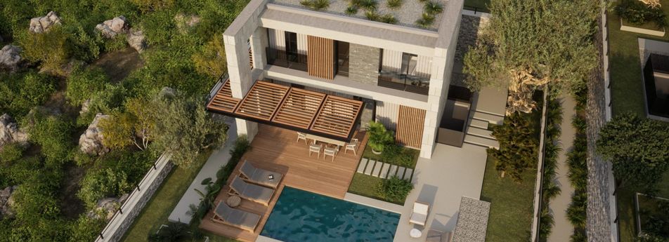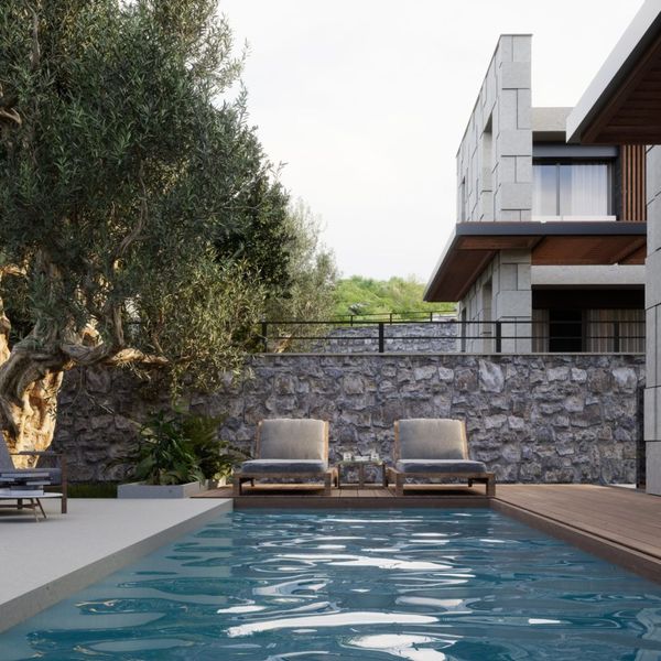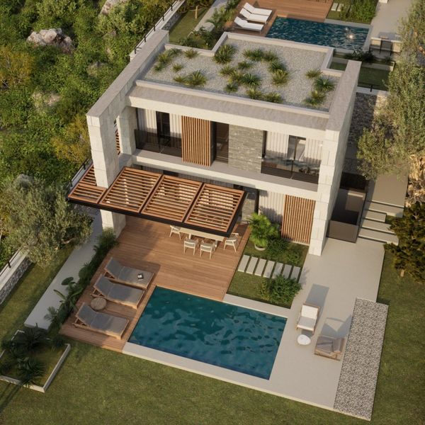 Все виллы имеют отдельный вход и парковочное место для автомобиля. К зданиям примыкает сад с уже выполненным ландшафтным дизайном. Виллы разделяет забор высотой 1,8 метра, который по желанию покупателя можно заменить на живую изгородь. На участке есть оливковые деревья возрастом до 1100 лет. У каждой виллы свой бассейн. В зданиях есть балконы и просторные террасы, где приятно проводить жаркие дни