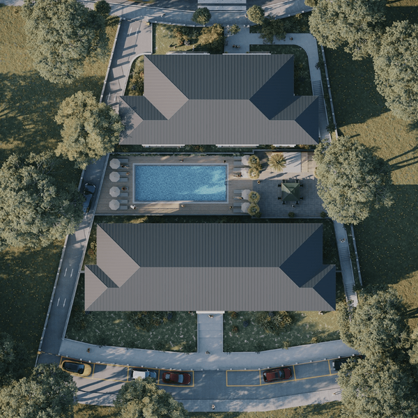 В жилом комплексе имеются все атрибуты цивилизации: бассейн, зоны для отдыха, дорожки для бега, магазины.