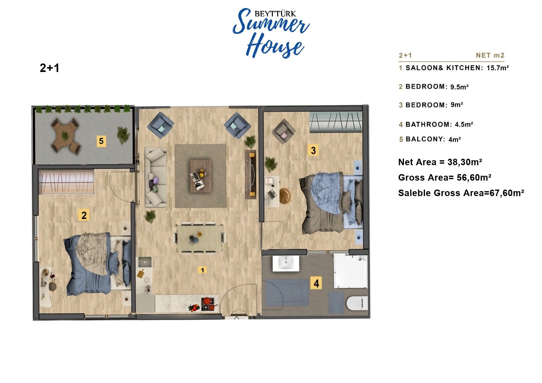 Квартира 2+1 в ЖК рядом с песчаными и уединенными пляжами